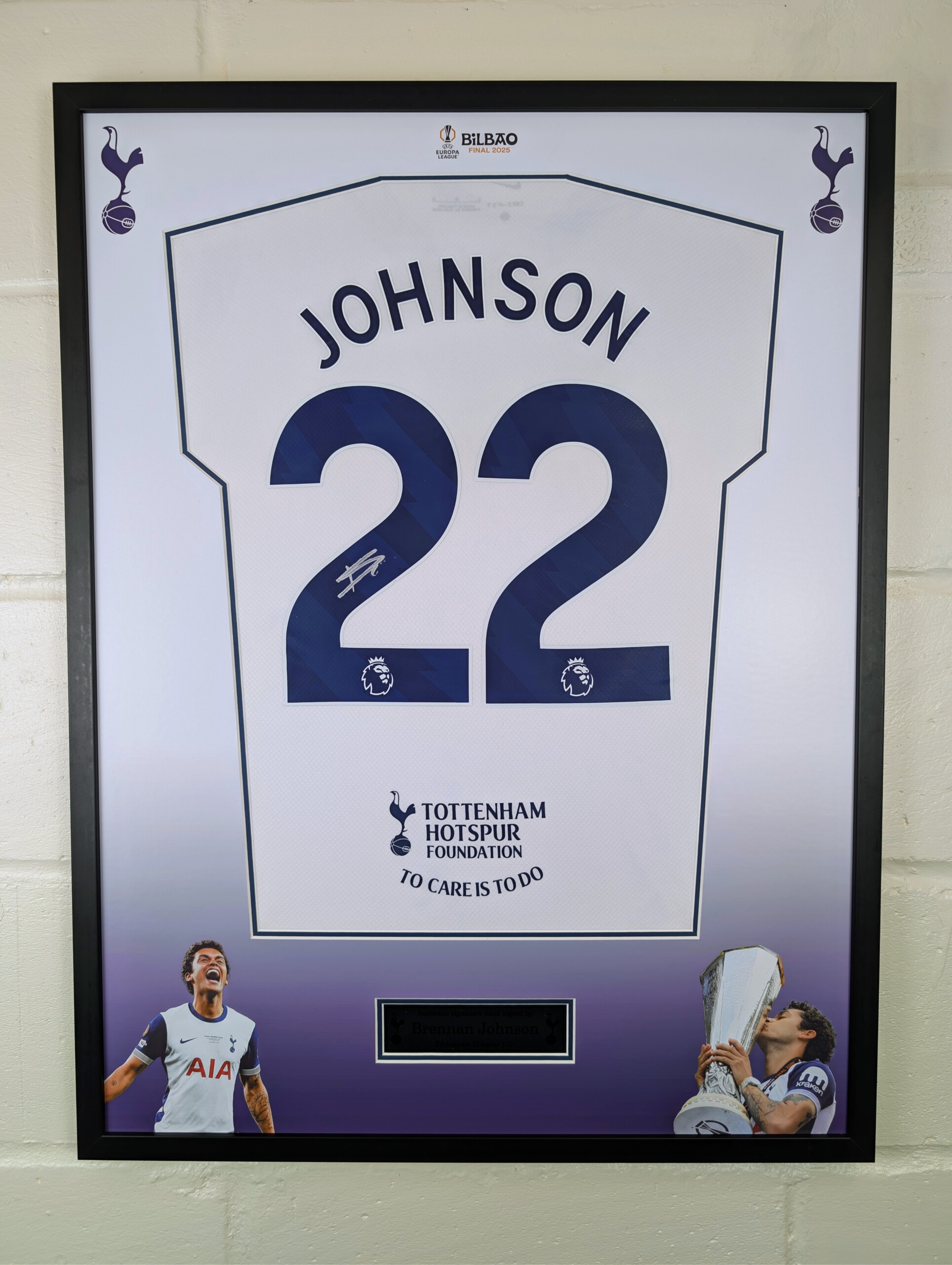 Brennan Johnson Signed Tottenham Hotspur Europa League Winners Football Shirt – Premium Framed Display with Black Frame, Double Printed Mount, Aluminium Printed Plaque & ACG Authentication.