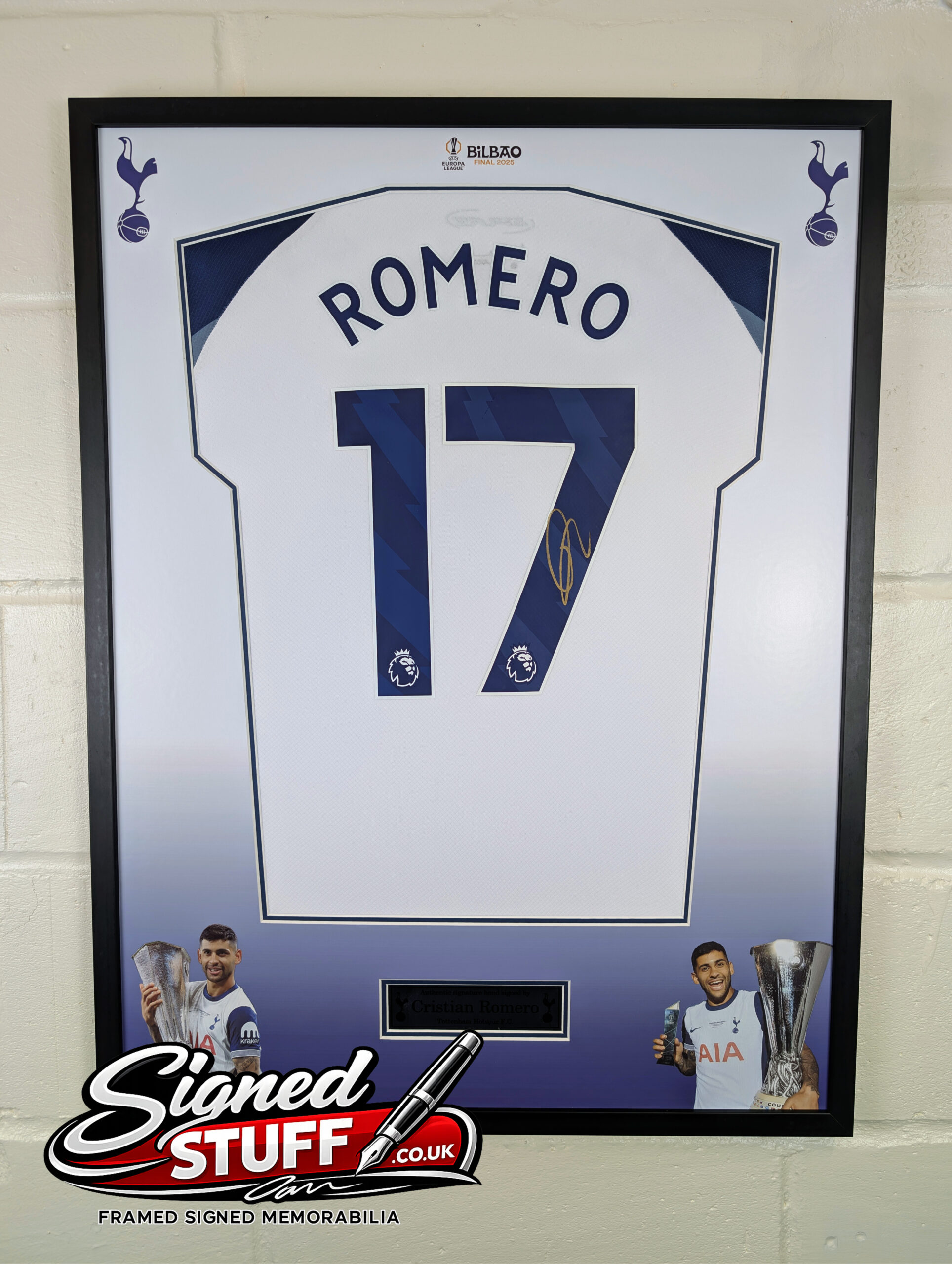 Elevate your sports memorabilia collection with this Cristian Romero Signed Tottenham Home Football Shirt. Premium Framed with Printed Mount, Aluminium Plaque & ACG Authentication. Expertly crafted in house for fans and collectors who demand the very best. Whether celebrating a favourite player, commemorating an iconic season, or investing in a standout showpiece, this framed shirt offers unmatched quality and presentation.