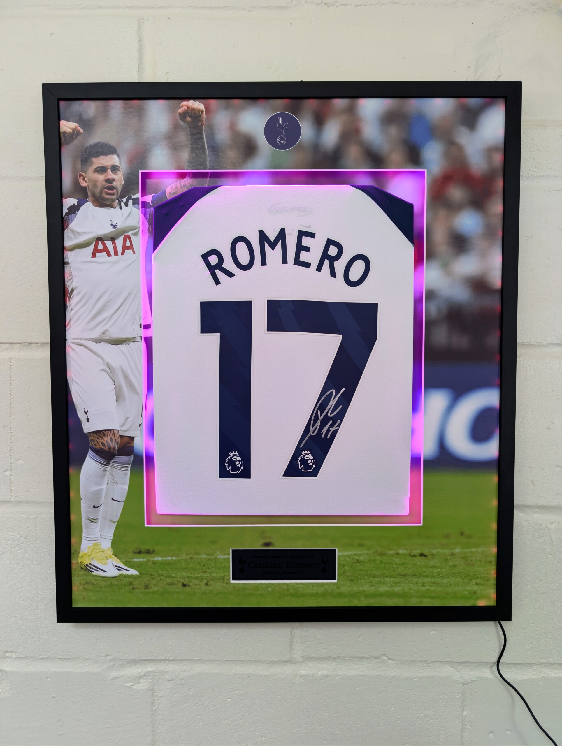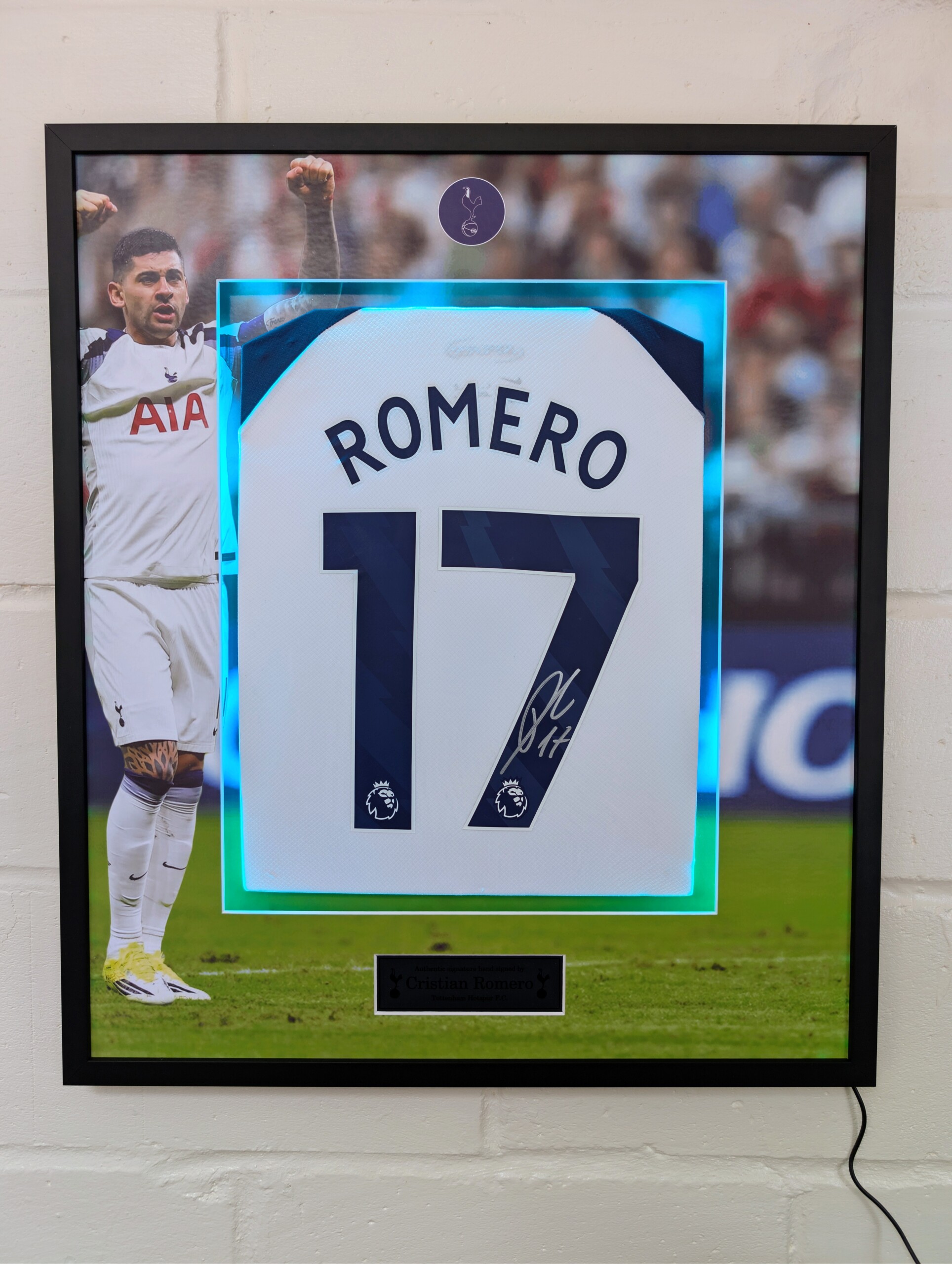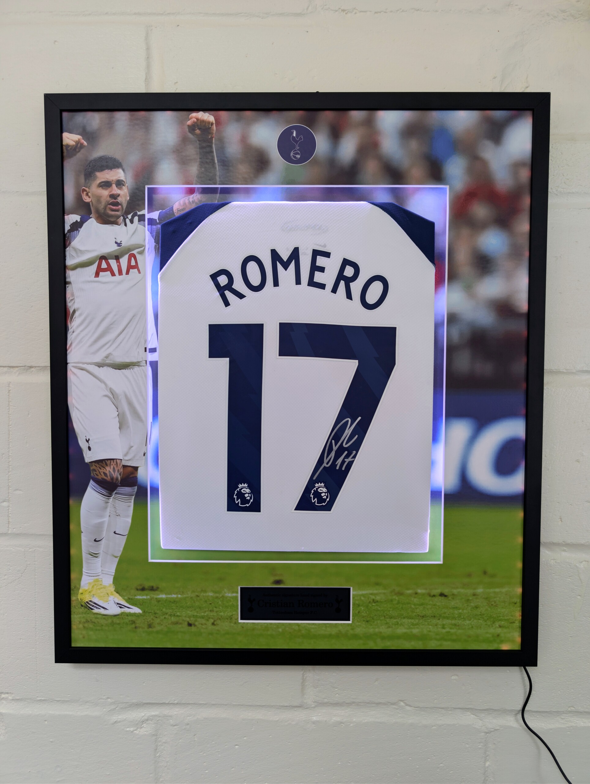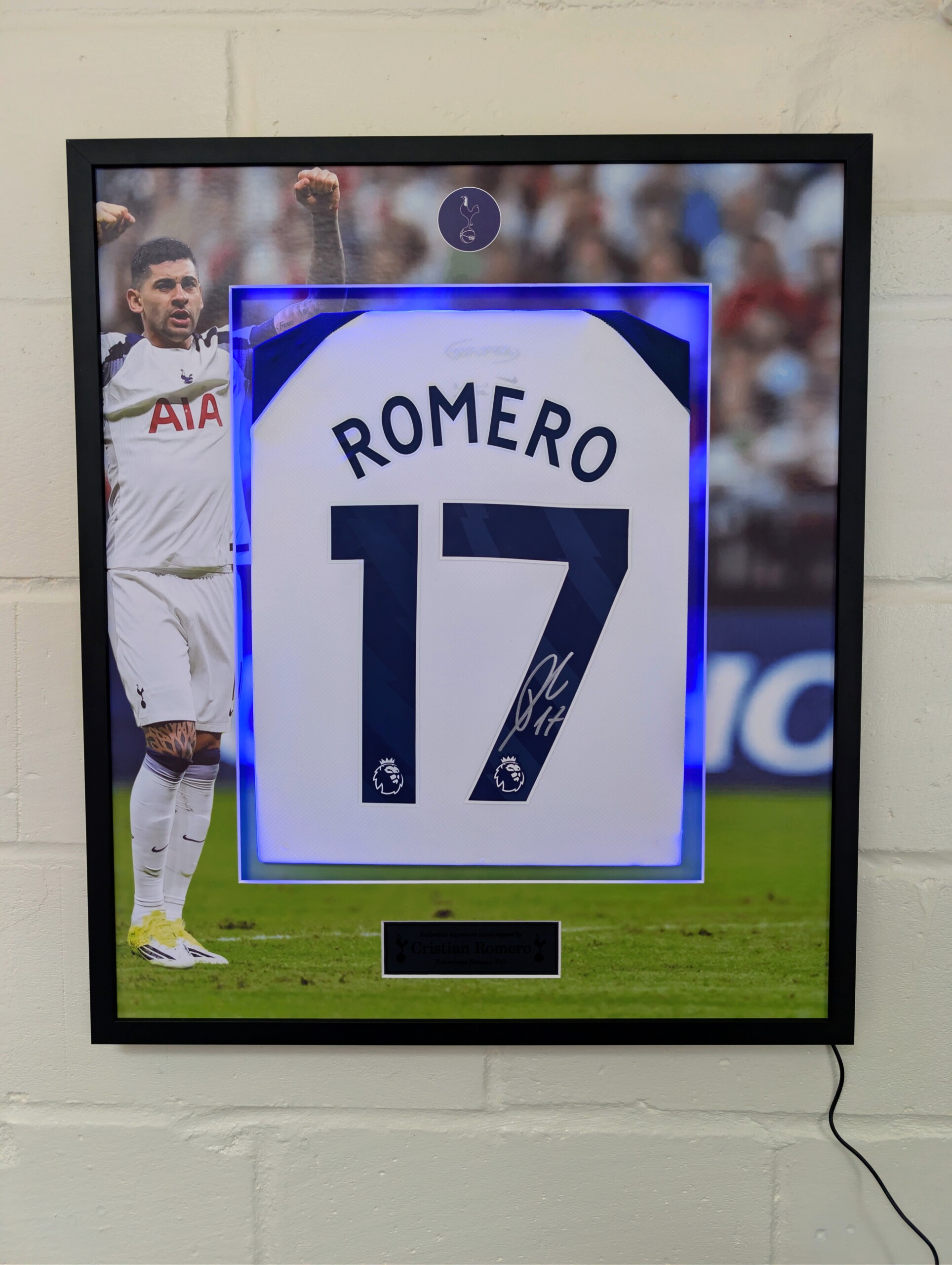 Cristian Romero Signed Tottenham Home Football Shirt – Luxury Framed With LED Background and Printed Mount, Aluminium Plaque & ACG Authentication.