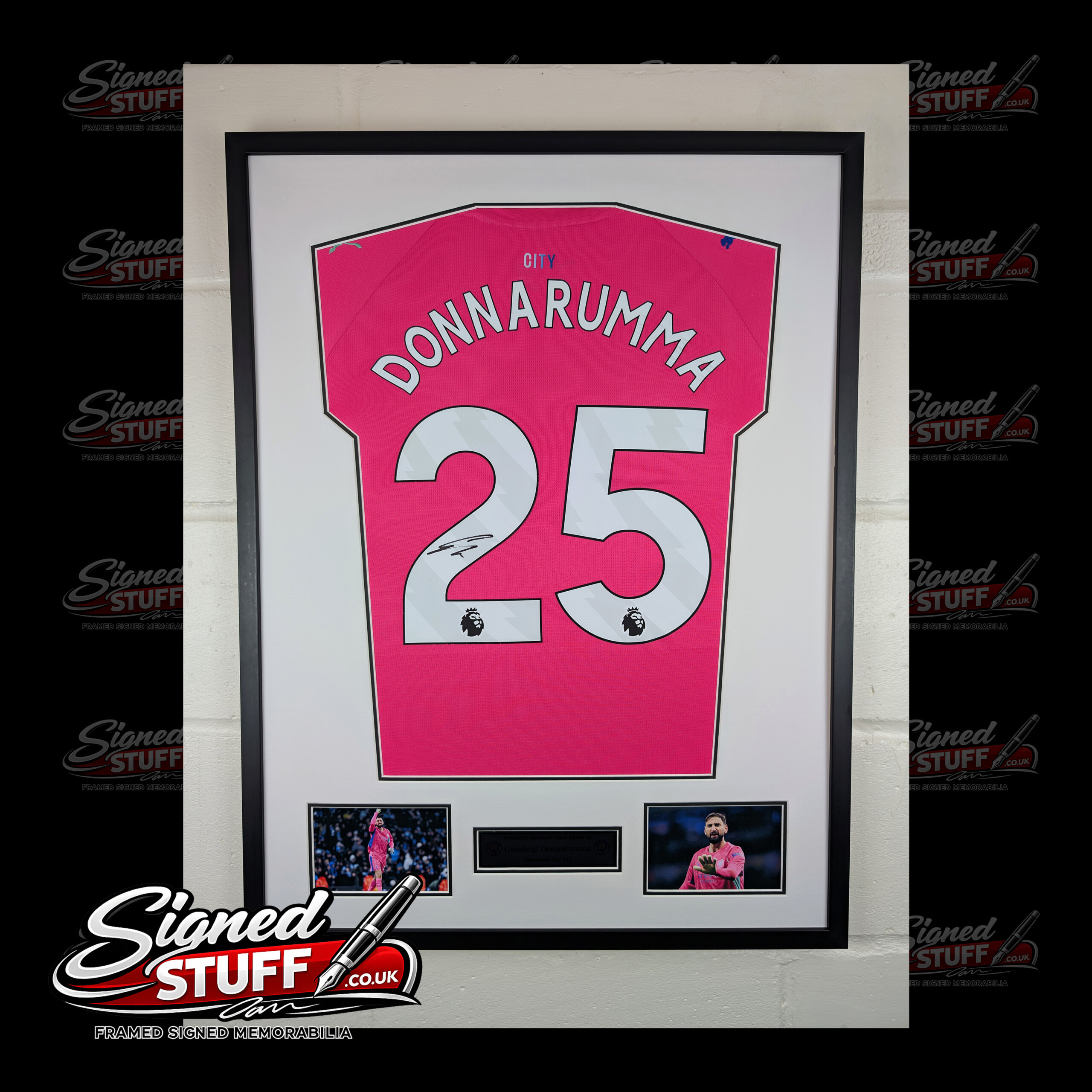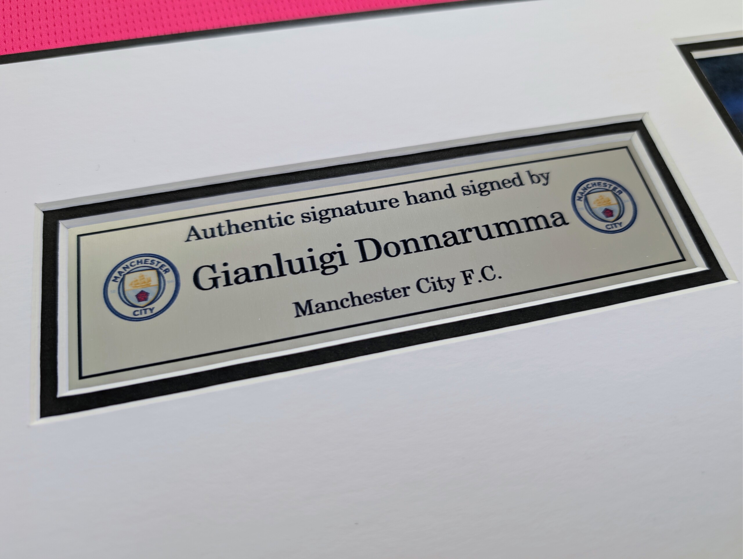 Gianluigi Donnarumma Signed Manchester City Football Shirt – Premium Framed with Black Frame, Double Mount, Aluminium Printed Plaque & Photo Proof Authentication.